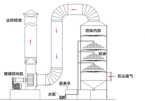 針對(duì)不同的廢氣成分選擇合適的處理方式是廢氣處理的基本,如上圖則是一張較為直觀的凈化流程。如果目的是清除廢氣中所含的灰塵,則在塔體內(nèi)部加入自來(lái)水即可,如果在廢氣中含有酸性成分,則需要將自來(lái)水更換為堿溶液(NaOH)。