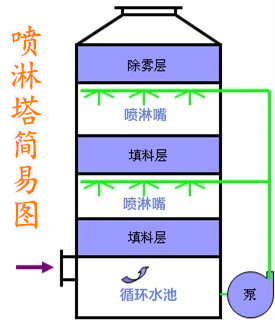 所謂的玻璃鋼噴淋塔,即采用噴淋的方式來達到凈化廢氣的效果。如下圖所示,由泵將比例噴淋塔底部的吸收液經(jīng)由噴淋管送至塔體內(nèi)部由噴淋嘴噴出并經(jīng)由填料層與廢氣進行充分的接觸。